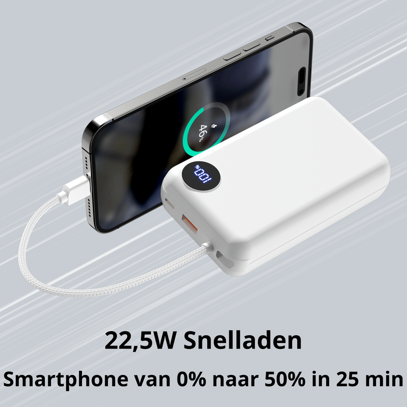 Dankzij 22,5W snelladen laad je een gemiddelde smartphone, zoals een iPhone of Samsung, van 0 naar 50% in slechts 25 minuten.