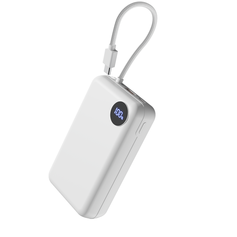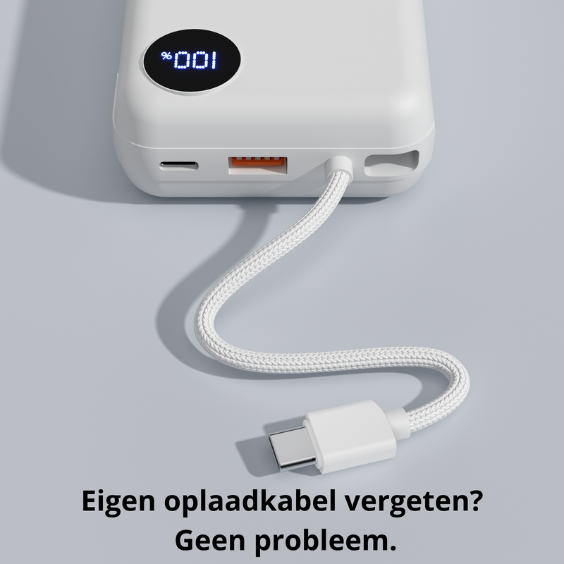 De powerbank is uniek en heeft een ingebouwde, vaste USB-C-kabel van sterk nylon gevlochten materiaal. Zo kun je altijd opladen, zelfs als je je eigen kabel bent vergeten.