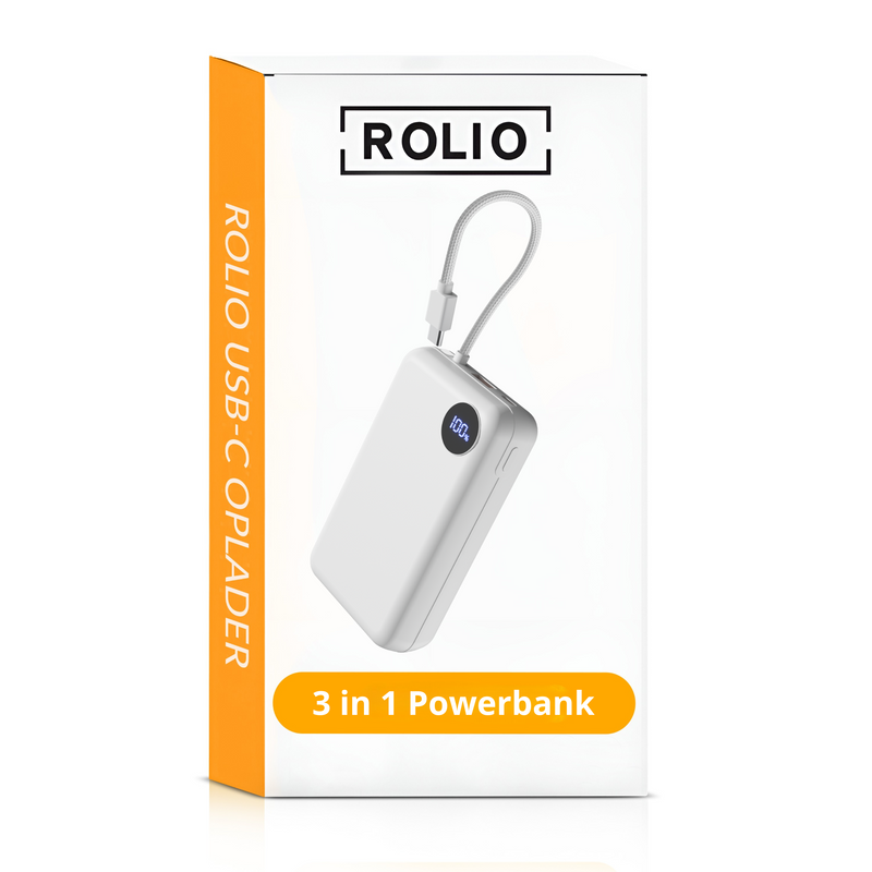 Rolio Powerbank - 20.000 mAh - 2x USB-C - 1x USB-A - Vaste USB-C kabel - 22,5W Snelladen - Geschikt voor iPhone, Samsung, Universeel